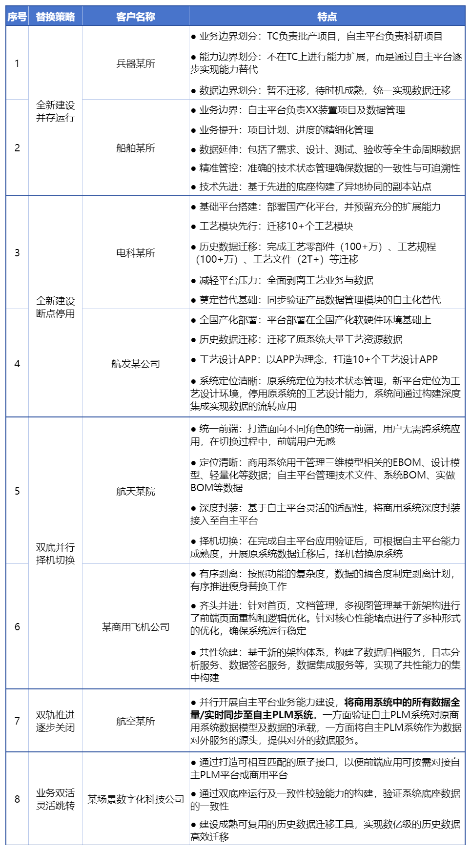 以上述五种替代策略为指导,国睿信维已经完成了国内众多客户的PLM平台的自主化替换,积累了丰富的替换经验: