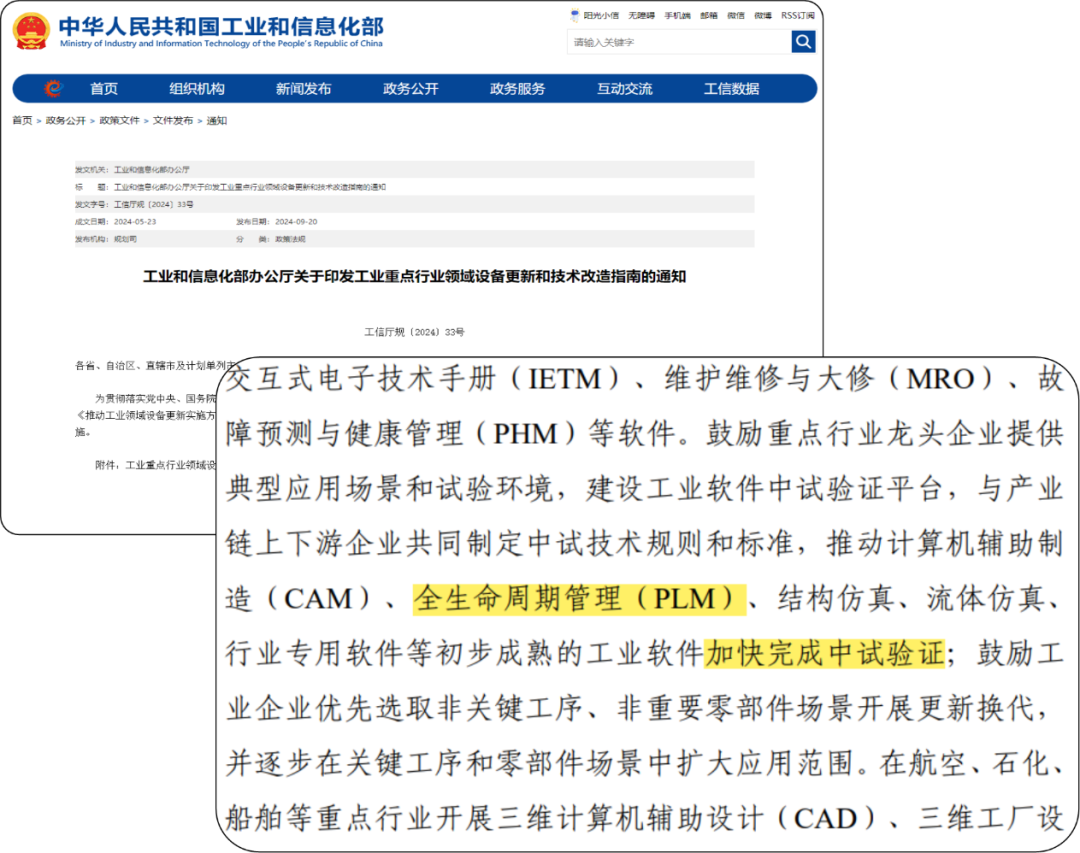 2024年9月20号,工信部发布的《工业重点行业领域设备更新和技术改造指南》中明确指出:鼓励重点行业龙头企业提供典型应用场景和试验环境,建设PLM中试验证平台,与产业链上下游企业共同制定中试技术规则和标准,推动PLM加快完成中试验证。